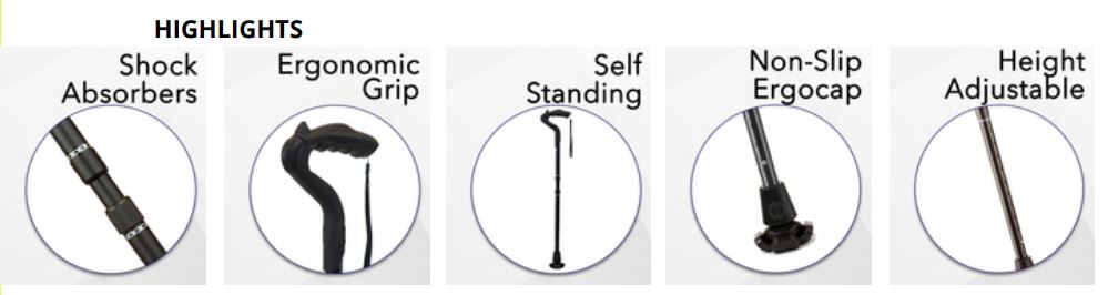 成人尺寸,手杖,减震,按件出售。减震器,防滑高性能 Ergocap(3/4 英寸),可调节高度,符合人体工程学的握把,可自行站立。